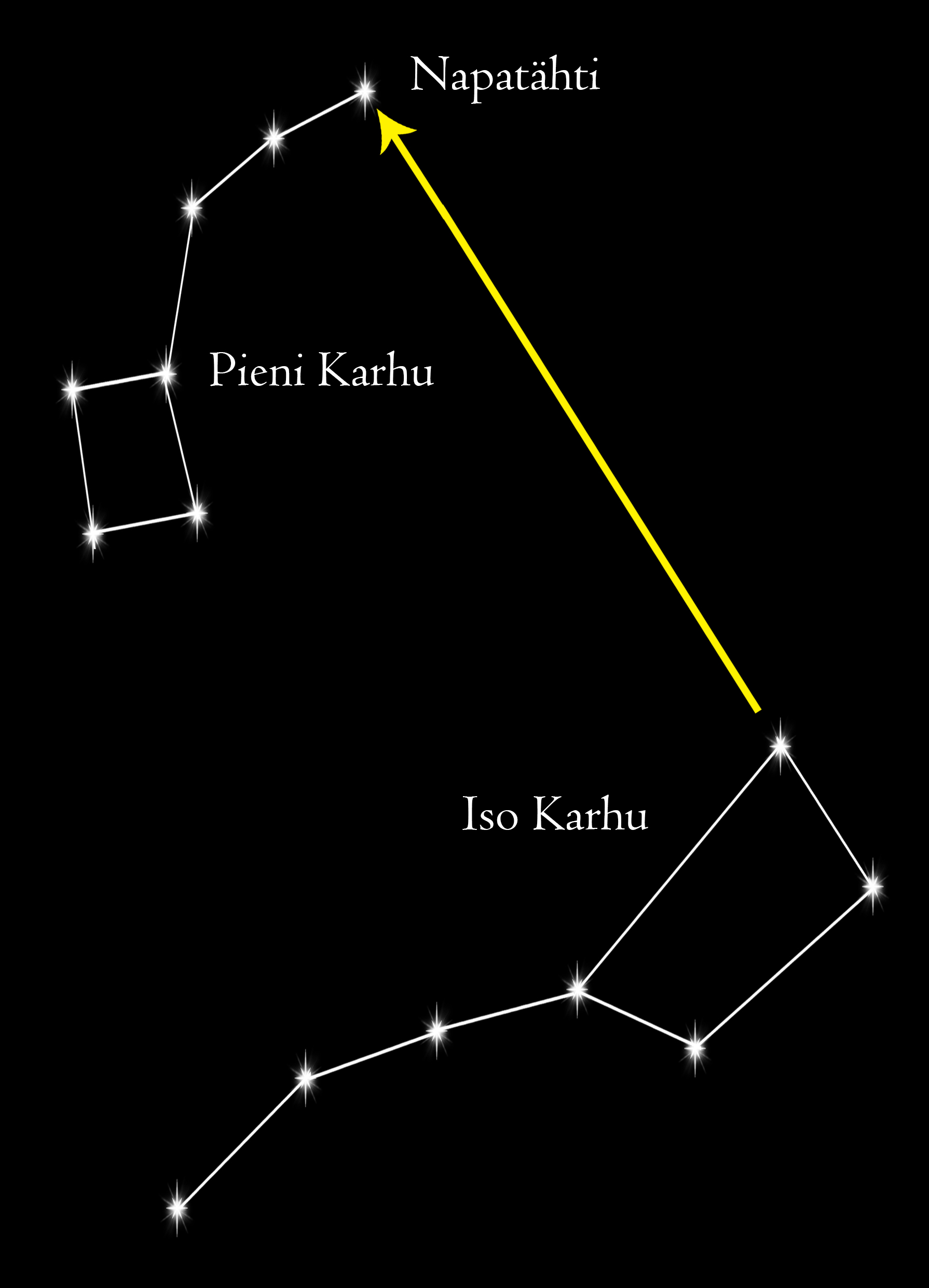 Ensimmäinen askel on löytää Pohjantähti eli napatähti. Napatähti on yksi pohjoisen pallonpuoliskon kirkkaimpia tähtiä, joka sijaitsee tarkalleen pohjoisessa suunnassa noin 50 asteen korkeudella. Tunnetko Otavan? Mikäli Otava on tuttu, voit käyttää sitä apuna napatähden löytämiseen. Kuvio oikealla näyttää, mitä etsiä.